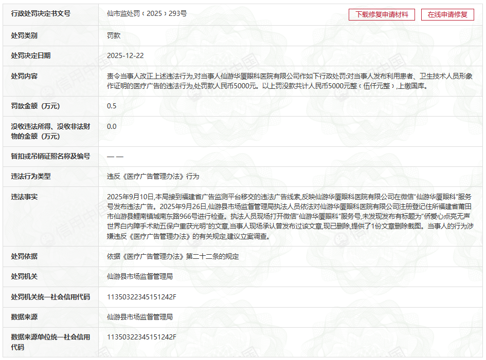 仙游华夏眼科医院因违反医疗广告相关规定,被市监管部门处罚。