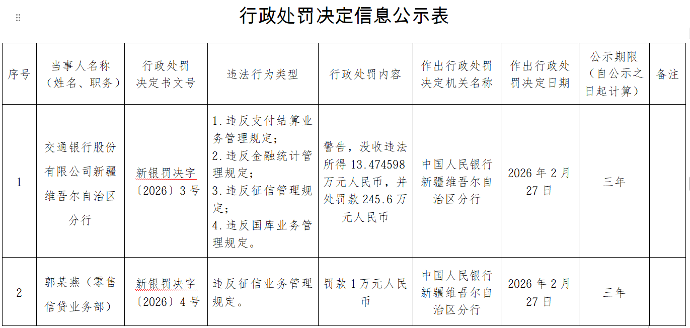 交通银行新疆分行因违反信贷管理规定被罚款259万元。